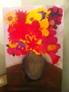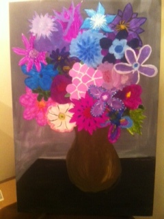 A true tour du force fitting of your most precious display space! This gallery-quality original painting has soul, expressing the optimism of the young and the young at heart. Feast your eyes on this beautifully rendered still life of a vase overflowing with flowers. A vibrant, expressive display of youthful energy. The central image is contained in a calming background that focuses and sets off the effervescent uninhibited center of the painting, which was created one flower at a time by our young artists and set in this gorgeous arrangement. 32 x 24 inch original acrylic painting.